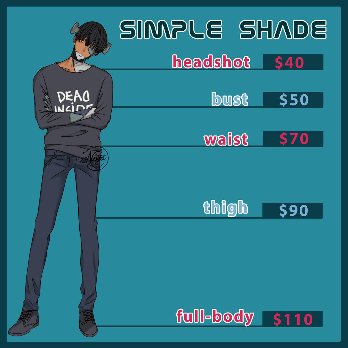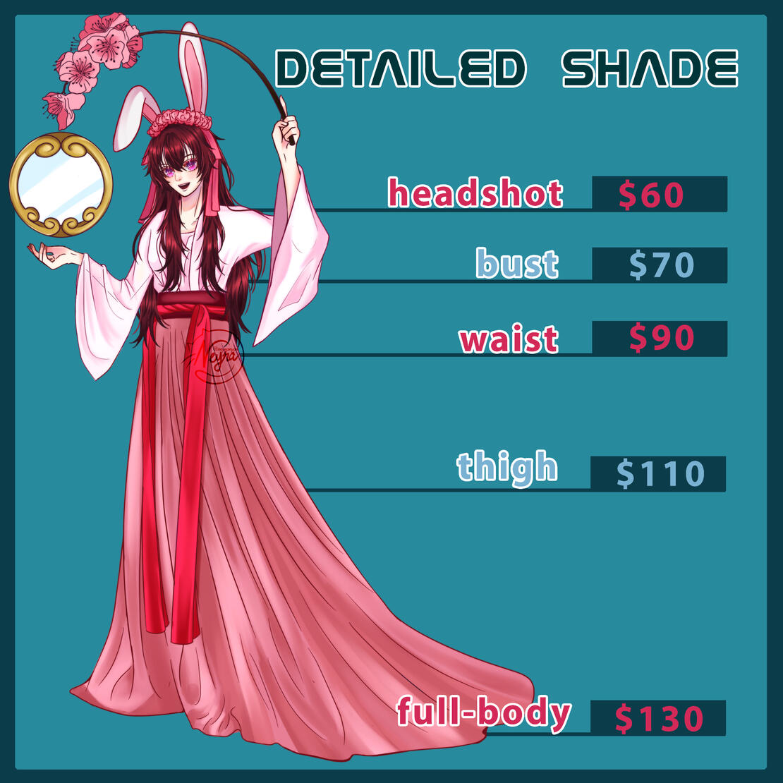 Type of commission: (Headshot, bust, waist, thigh, full-body | Flat colors, simple shaded, detailed shaded or Ko-Fi commission)